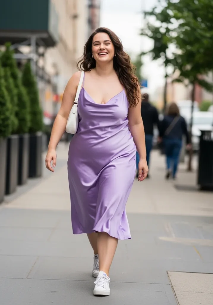 This silky lavender slip dress brings a sleek and modern vibe to a spring birthday outfit. The satin fabric drapes smoothly along the body and creates soft natural folds as it moves. White sneakers and a small handbag give the look a relaxed city feel that feels stylish but totally wearable.