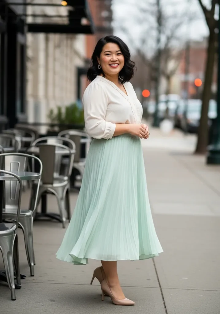 A flowing mint green pleated skirt paired with a simple cream blouse creates a fresh and airy spring outfit. The skirt has beautiful natural movement while the blouse keeps the look balanced and polished. Nude heels and delicate accessories finish the outfit in a subtle and elegant way.