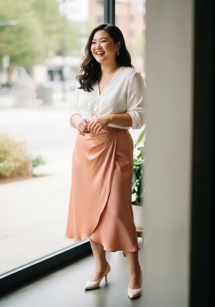 A soft peach satin midi skirt paired with a lightweight white blouse creates an outfit that feels elegant but still easygoing. The skirt has a beautiful silky sheen and gentle folds that move naturally while walking. Neutral heels and minimal accessories keep the look fresh and modern.