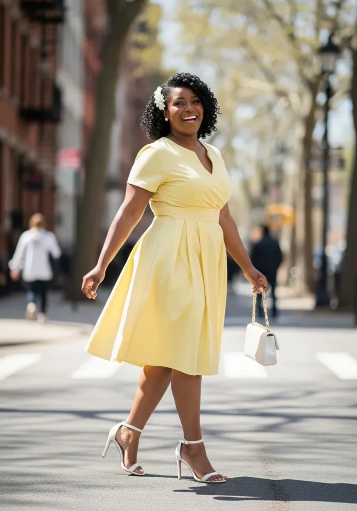 This cheerful yellow fit and flare dress brings bright spring energy to a birthday outfit. The dress features a flattering waistline and a softly structured skirt that flows beautifully with movement. Nude heels and a small handbag complete the sunny and polished look.