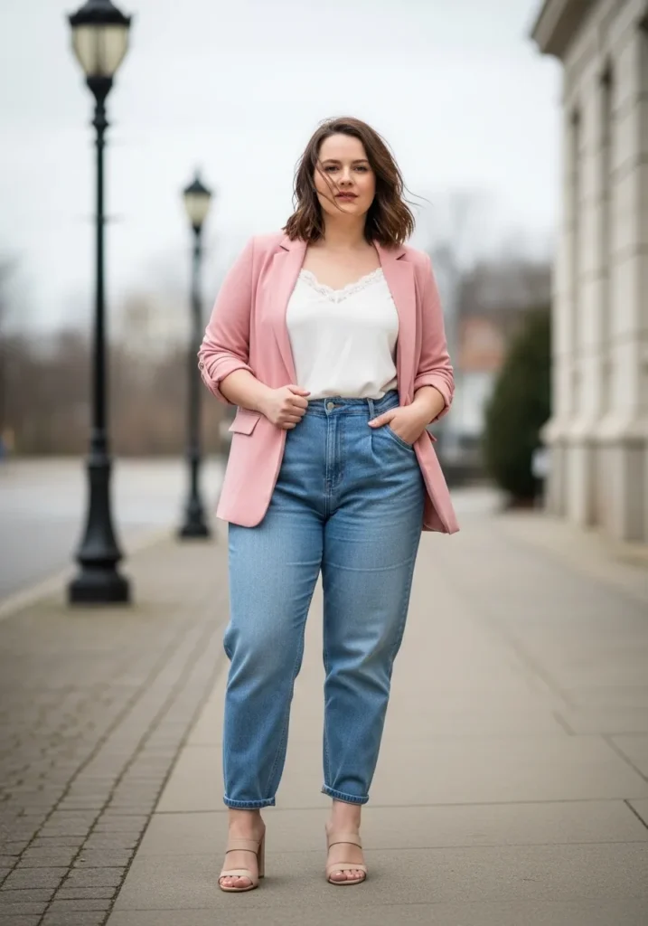 A light blush pink blazer layered over a simple white top and classic blue jeans creates a relaxed but stylish birthday outfit. The structured blazer adds polish while the denim keeps everything comfortable and approachable. Neutral heels and a soft street background complete the effortlessly chic vibe.