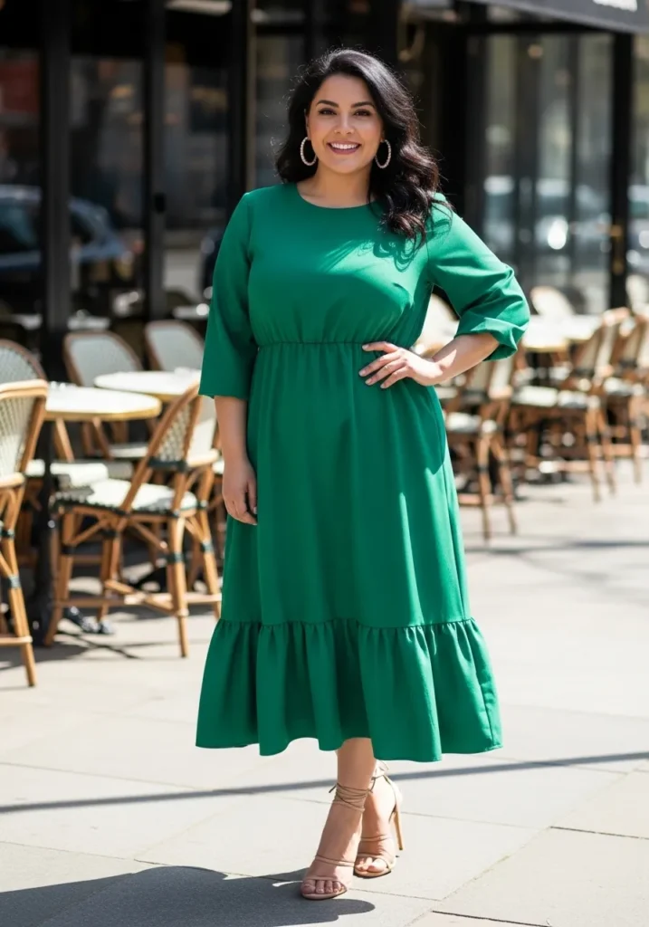 A rich emerald green midi dress with soft flowing fabric creates a bold yet graceful spring look. The dress drapes naturally with gentle folds and the relaxed silhouette gives it a comfortable and confident feel. Neutral heels add just enough polish while keeping the focus on the vibrant color.