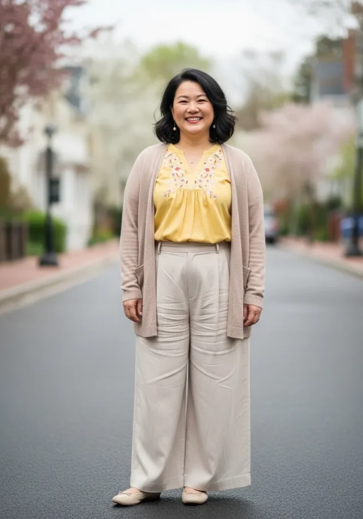 This outfit features a breezy and elegant mix of soft spring neutrals. A silky yellow blouse adds a cheerful touch while a long lightweight beige cardigan drapes comfortably over the shoulders. The look is paired with relaxed wide leg cream trousers that flow beautifully with every step. Neutral flats complete the outfit, giving it an effortless and polished feel that works perfectly for a calm stroll through town.