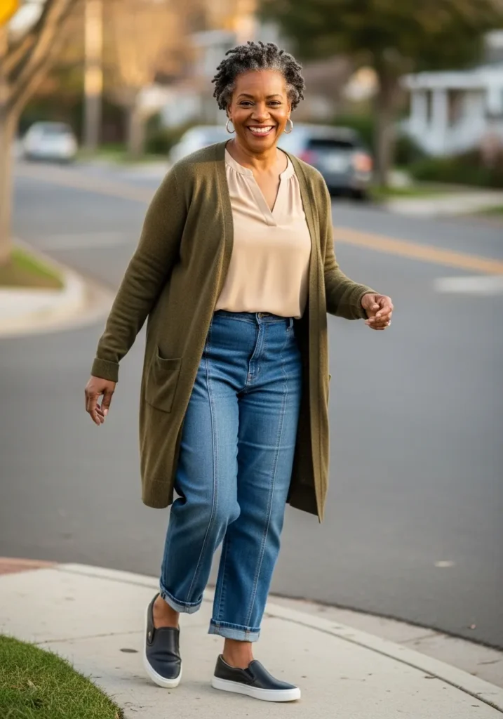 This outfit pairs a soft beige blouse with classic blue jeans and a long olive cardigan that flows gently as you walk. Comfortable slip on shoes complete the outfit while the relaxed fit makes it ideal for everyday errands or a casual outing.