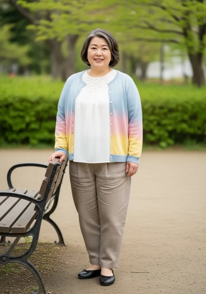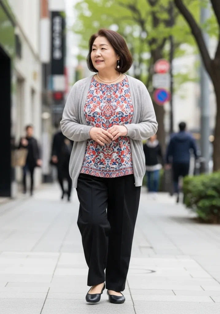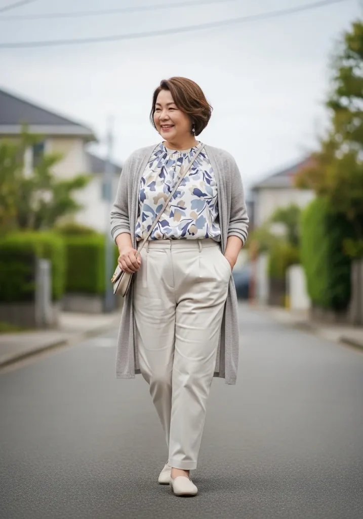 This outfit feels light and elegant with a delicate floral blouse tucked into relaxed beige trousers. A soft neutral cardigan adds a gentle layer that flows nicely as you move. Comfortable flats complete the outfit and make it perfect for a quiet stroll through the neighborhood.
