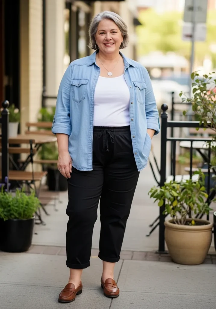 This outfit mixes casual and polished pieces beautifully. A soft denim shirt sits over a white tee while black ankle trousers keep the outfit looking neat and flattering. Brown loafers add a touch of classic style while keeping everything comfortable for walking around the city.