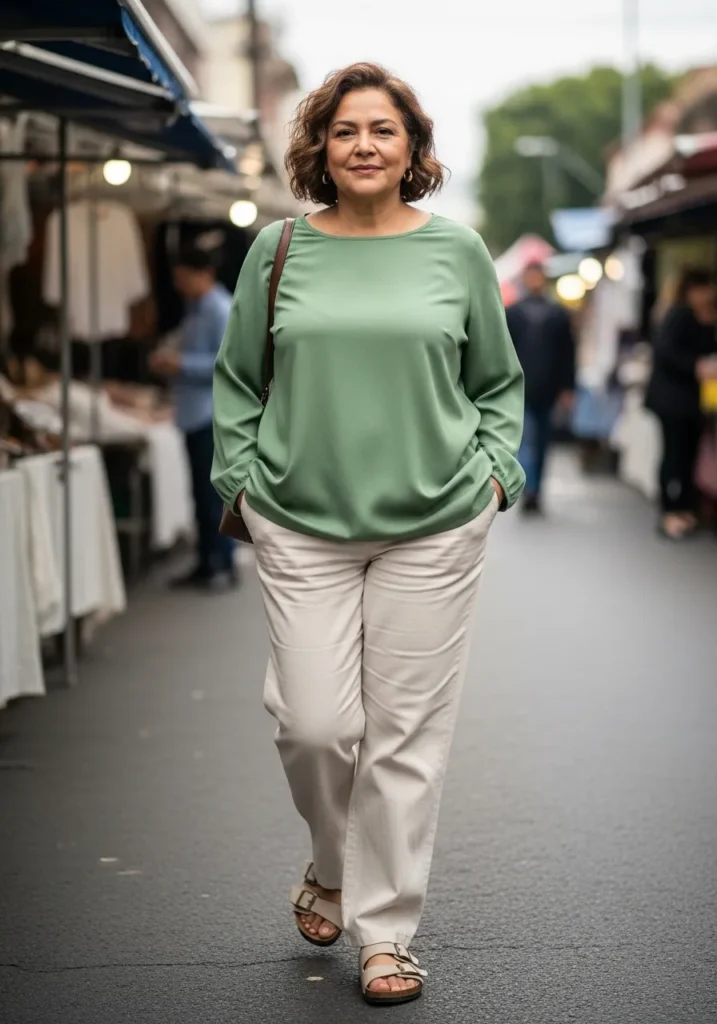 This outfit feels perfectly suited for a casual day strolling through a local market. A soft sage green long sleeve blouse drapes loosely over comfortable beige trousers that offer a relaxed wide leg silhouette. The neutral pants keep the look grounded while the soft green top adds a fresh spring feel. Simple flat sandals finish the outfit and keep everything easy and breathable.