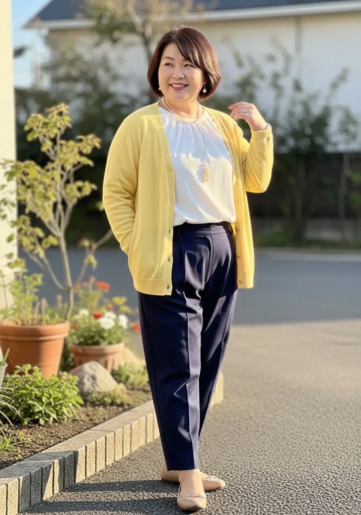 This outfit brings a cheerful burst of color with a sunny yellow cardigan layered over a simple white top. The cardigan pairs beautifully with navy trousers that give the outfit a polished and balanced look. Neutral flats keep everything comfortable while the bright cardigan becomes the happy centerpiece of the outfit.
