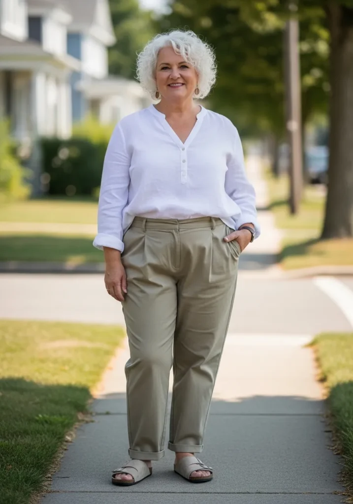 This outfit is a perfect example of effortless simplicity done right. A crisp white button down shirt sits neatly over relaxed khaki trousers that have a comfortable tailored shape. Neutral sandals keep the look practical while the soft earthy tones create a calm and polished appearance.
