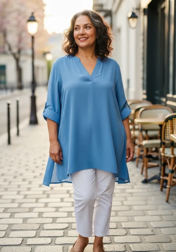 This outfit features a flowing blue tunic top that moves beautifully as you walk. The loose silhouette pairs perfectly with slim white pants which create a lovely contrast against the soft blue fabric. Comfortable flats keep the outfit practical while the airy tunic gives the look a relaxed elegance.