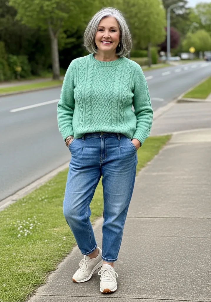 This outfit feels like the ultimate relaxed spring look. A soft green knit sweater pairs perfectly with classic blue jeans that have a slightly relaxed fit. Comfortable white sneakers keep the outfit casual and practical while the soft knit texture adds warmth and charm.