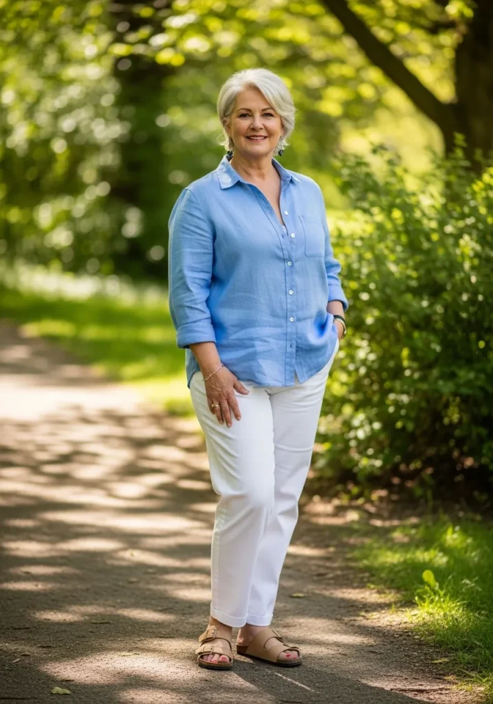 This outfit feels bright and polished with its fresh color combination. A light blue button down shirt adds structure while relaxed white trousers bring a clean and airy feel. Comfortable flats keep the look simple and practical while the natural park setting makes the whole outfit feel perfectly suited for spring.