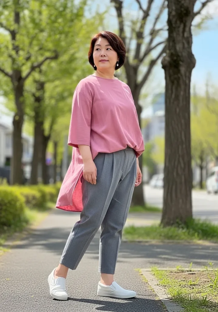 This outfit feels modern and breezy with its soft pink top and relaxed gray ankle pants. The loose fit top drapes comfortably while the tapered pants keep the overall look neat and streamlined. White sneakers give the outfit a sporty casual touch that works beautifully for everyday wear.