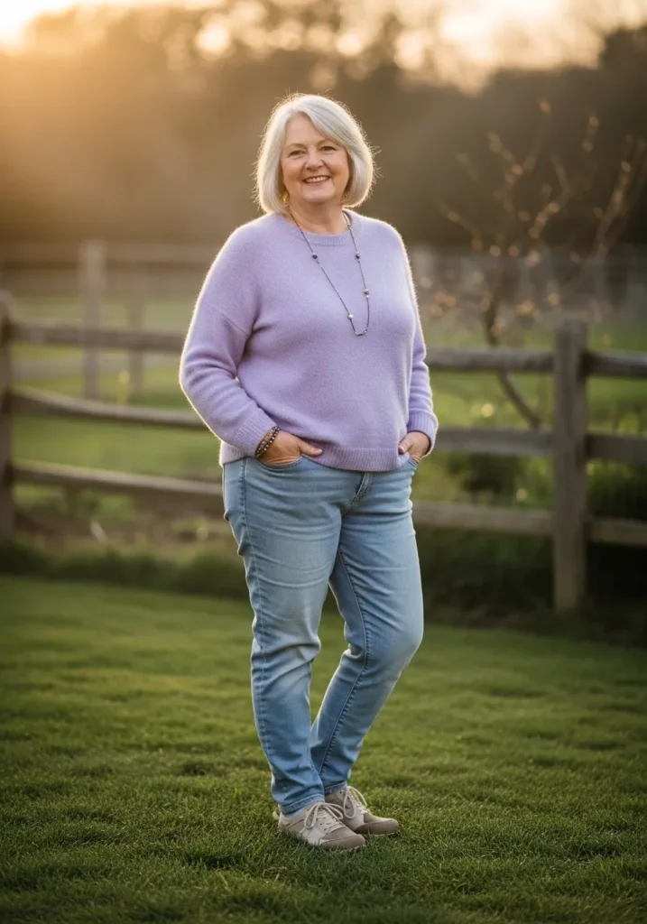 This outfit captures that cozy spring evening feeling with a soft lavender sweater and relaxed blue jeans. The sweater looks warm and inviting while the denim keeps the look casual and practical. Neutral shoes finish the outfit with an understated and comfortable touch.
