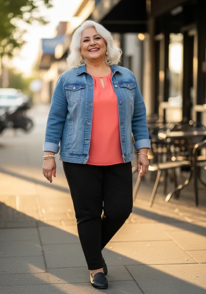 This outfit combines timeless pieces that always work together. A structured denim jacket layers easily over a bright coral top that adds a fun burst of color. Black pants keep the outfit sleek while simple flats maintain comfort for walking around town.