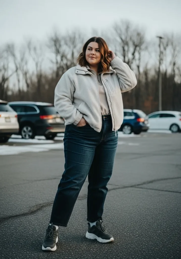 This outfit pairs a soft light gray fleece jacket with a simple neutral top and a pair of dark wash straight leg jeans. The fleece looks warm and plush without feeling bulky, and the jeans give the whole look a clean everyday polish. Chunky gray sneakers add a sporty touch that keeps the outfit practical for cold weather errands or casual meetups. The overall vibe is relaxed, cozy, and effortlessly put together, the kind of outfit you reach for when you want comfort without sacrificing style.