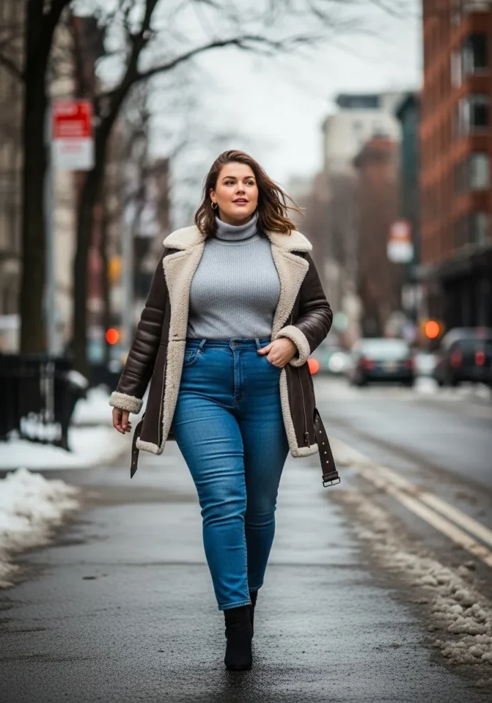 This outfit is such a winter classic with a chic twist. The look pairs a soft gray ribbed turtleneck with high rise medium wash jeans that fit like a dream. The star of the show is the chocolate brown shearling jacket with its plush cream lining that peeks out at the collar cuffs and hem. The textures play so well together and the whole vibe feels warm polished and totally effortless as she walks down a wintery city street.
