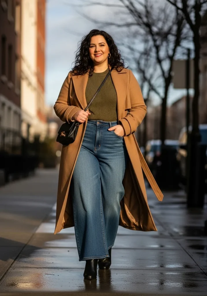 I love how this outfit balances comfort and confidence. The long camel coat feels instantly elevated and the wide leg jeans create a flattering line that makes the whole look feel relaxed yet intentional. I find the olive sweater such a pretty contrast under the warm coat. It feels like the kind of outfit I would reach for again and again because it looks put together without feeling fussy.