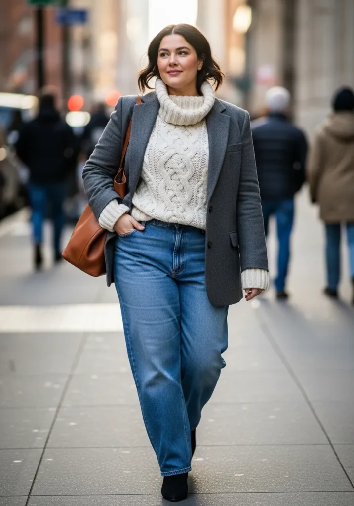 I love how this outfit hits that sweet spot between cozy and put together. The structured jacket brings shape while the fitted turtleneck keeps everything sleek. The jeans show off the silhouette without feeling tight and the black ankle boots add a clean finish. I always feel like this mix of soft neutrals and great denim brings out the best in my figure. It looks confident feels comfy and works for just about any cold weather day.