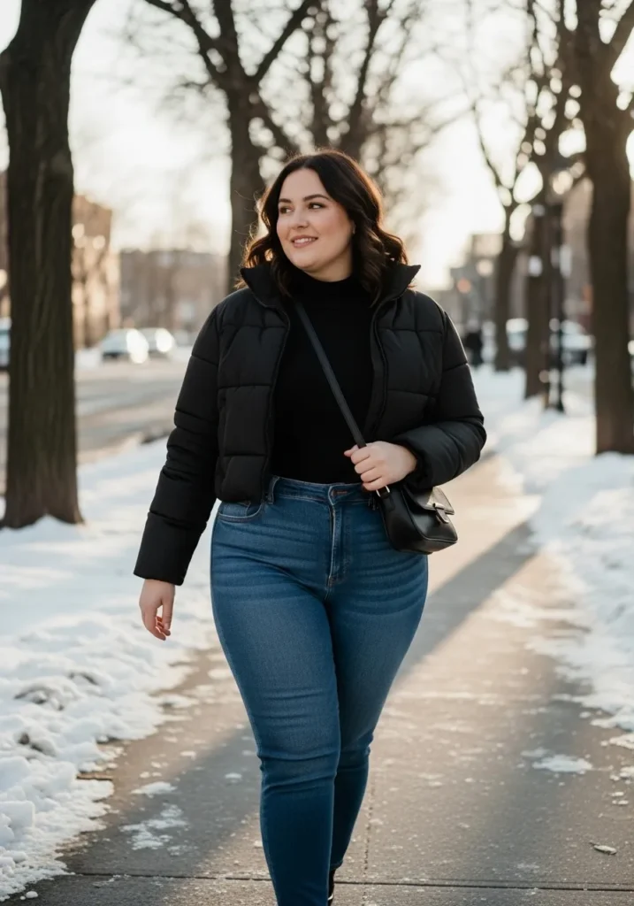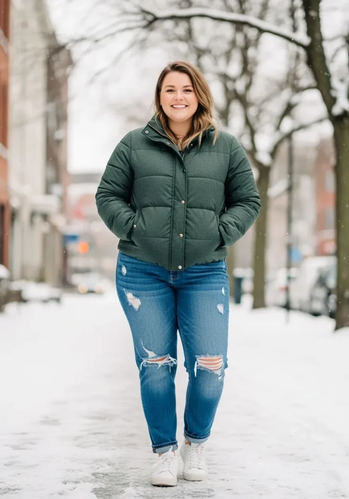 I love this outfit because it strikes that perfect balance between practical and stylish. The puffer gives warmth without feeling bulky and the ripped jeans add personality that feels young and fun. It is one of those outfits that looks great on curves because everything fits in a way that feels natural and relaxed. It is simple pieces styled in a way that just works every single time.