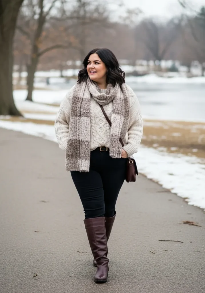 This outfit is such a winter sweetheart moment with its chunky cream cable knit sweater that instantly feels warm and comforting. The oversized woven scarf in soft taupe tones adds that extra snug vibe without looking bulky. She pairs everything with classic dark skinny jeans that create a clean line from hip to boot, and the rich brown knee high boots tie the whole look together in the most polished way. The crossbody bag sits neatly at the hip and brings a little practicality to the outfit while keeping things cute and effortless.