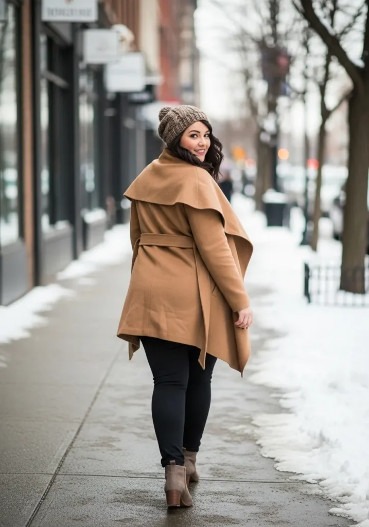 I love this look because it proves that cozy layers can still feel stylish. The wrap coat brings shape without feeling restrictive and the black jeans balance everything with a slimming base. The beanie makes the outfit feel friendly and real, not overly styled. It is one of those winter combinations that works for brunch, errands or a snowy stroll while looking like you have your life at least somewhat together.