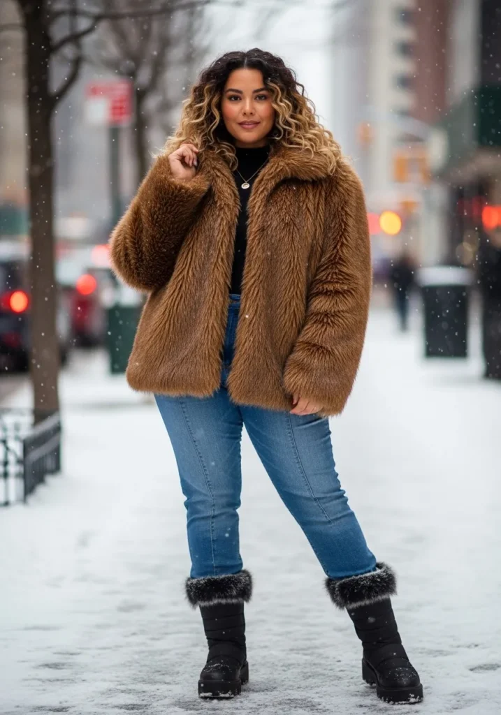 This outfit instantly gives warm glam energy with a plush brown faux fur coat that looks like the fashion equivalent of a hug. It sits beautifully over a simple black top that keeps the look sleek. The medium wash skinny jeans add structure and balance to all that delicious texture on top. The black winter boots with soft faux fur trim tie everything together and create the cutest winter ready finish. The whole vibe feels polished but still practical enough for snowy sidewalks and chilly days out in the city.