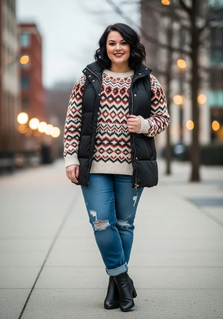 This look brings together a chunky Fair Isle sweater in warm earthy tones with a sleek black puffer vest that adds structure without feeling bulky. The distressed medium wash jeans keep things relaxed and wearable while the black ankle boots pull everything together with a clean finish. The whole outfit feels cheerful and winter ready with a casual city stroll vibe that still looks polished enough for coffee dates or weekend errands.