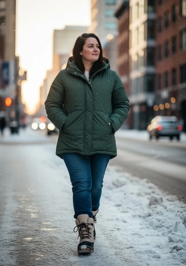 This look brings together a deep green puffer jacket with a clean quilted finish that instantly feels warm and outdoorsy. The jacket has a hood for extra snug vibes and a slightly structured fit that pairs beautifully with the medium wash jeans. The denim is fitted without feeling tight and keeps the whole look balanced. Winter boots in a soft beige and black mix finish things off with a practical but stylish touch. The whole outfit gives that effortless city winter mood where comfort meets cute without even trying.