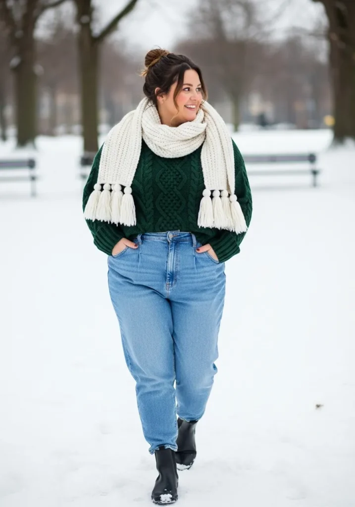 This look feels like the happiest kind of winter day. The deep green cable knit sweater sets a rich and comforting base that looks gorgeous against the snowy backdrop. Paired with light blue high waisted jeans, the outfit has that effortless, relaxed fit that never feels fussy. The oversized ivory knit scarf with chunky tassels brings in warmth and a touch of playful texture. Black ankle boots finish the outfit with a practical but polished touch. Altogether it feels soft, snuggly, and stylish without trying too hard.