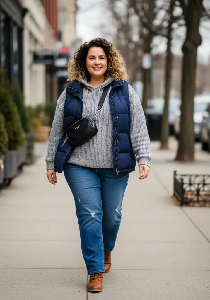 This outfit mixes comfort with a little city attitude in the best way. The grey knit hoodie feels warm and snuggly, and pairing it with a navy puffer vest instantly gives the whole look that casual winter charm. The medium wash jeans keep things classic with a few gentle distress marks for interest. Brown lace up boots add a touch of outdoorsy warmth, and the small black crossbody bag keeps everything practical for a busy day out. The whole vibe feels relaxed, approachable and totally ready for a chilly morning stroll.