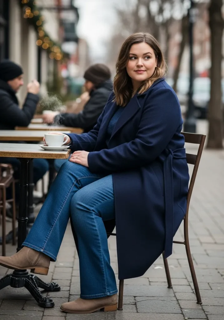 I love how this look works because the monochrome navy on top creates such a smooth visual line that instantly feels flattering. The wrap coat adds shape without feeling bulky and the flared jeans always do wonders for balancing curves. It is one of those winter outfits that feels simple but secretly smart and stylish. Honestly I would wear this on repeat all season.