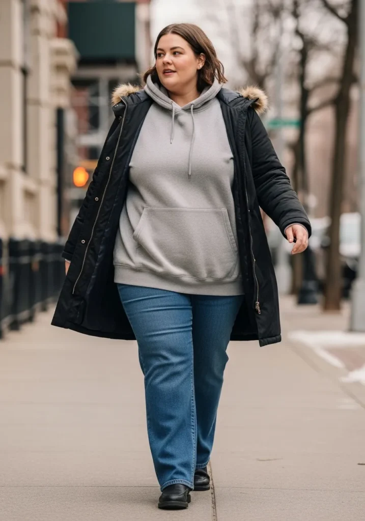 This outfit brings together a soft grey hoodie with a roomy front pocket and a warm black parka trimmed with faux fur along the hood. The light blue jeans add a casual balance, creating that perfect everyday winter vibe that still feels pulled together. Black winter boots ground the look with a practical touch, making the whole outfit feel comfortable and city ready. The mix of textures from the fleece lined hoodie to the structured parka makes everything look effortlessly stylish while still being cozy enough for cold days.
