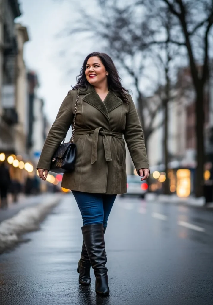 This outfit is such a winter staple and it feels instantly polished without trying too hard. The rich olive wrap coat has that soft suede look with a cozy textured collar and a tie belt that creates the prettiest cinched shape. Paired with dark blue skinny jeans and tall black leather boots, the whole look feels sleek and city ready. The black quilted shoulder bag adds a little touch of elegance that pulls everything together without overpowering the outfit.