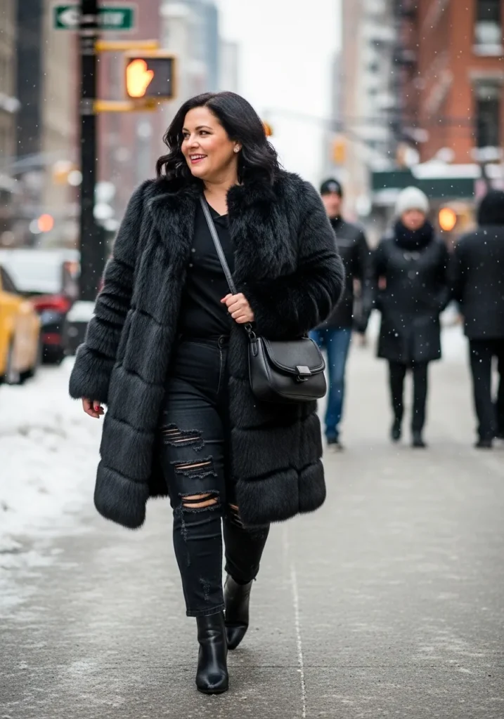 This outfit is the definition of chic winter confidence. The star is a plush black faux fur coat with that soft quilted texture that instantly feels luxurious. Underneath, she keeps things sleek with a simple black top paired with distressed black skinny jeans that add a little edge to the look. Black heeled ankle boots sharpen the whole outfit while a small black crossbody bag pulls everything together. The all black palette looks polished and modern while the cozy textures keep it warm and city ready.