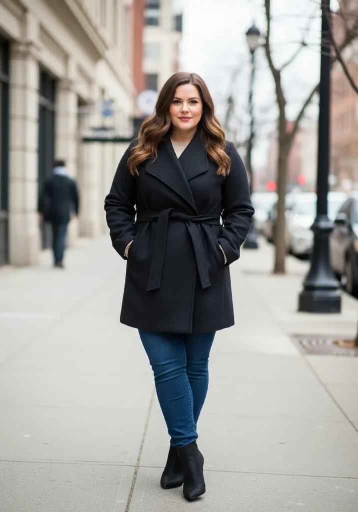 This look mixes winter warmth with a clean and polished vibe. The outfit features a black wrap coat in a soft wool blend that ties neatly at the waist for a tailored and feminine shape. Underneath, a light neutral sweater peeks through just enough to soften the dark outer layer. The coat pairs beautifully with medium wash skinny jeans that add a subtle contrast and keep the whole outfit feeling modern. Black ankle boots finish everything off with a sleek touch that works perfectly for city streets, casual days, or a quick coffee run. The overall feel is effortless, refined, and quietly confident.