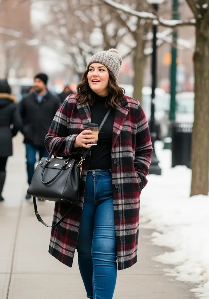 I love this look because it feels stylish without making me try too hard. The bold plaid coat does all the heavy lifting while the black top and jeans keep things streamlined. This combo always feels flattering on me because the coat adds shape without bulk and the jeans give just the right amount of structure. Plus, the beanie makes the whole outfit feel fun and cozy, which is exactly what I want on freezing winter mornings.