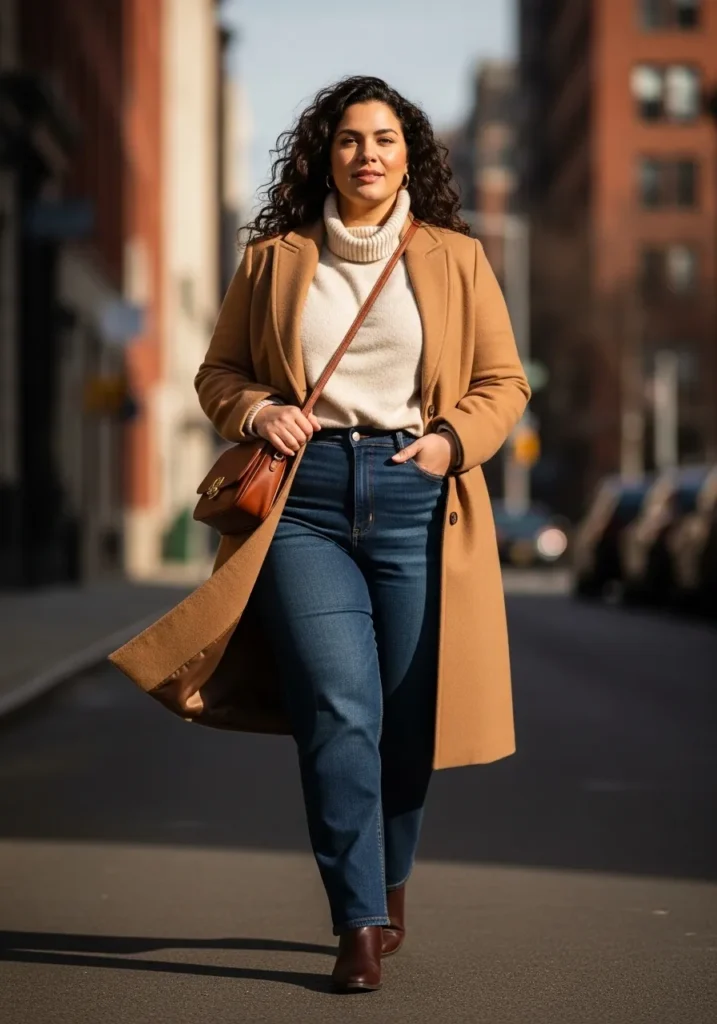 This look brings together all the winter basics we love. She is wearing a warm camel coat in a soft wool texture that instantly makes any outfit feel polished. Underneath is a cream turtleneck sweater that looks plush and comfortable without feeling bulky. The medium wash jeans add just the right amount of structure and keep the outfit grounded. A small brown crossbody bag pulls the colors together while the dark ankle boots give the whole look a clean finish. The vibe is classic city winter with a soft and effortless feel.