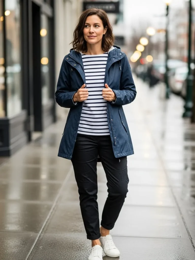 This outfit pairs a navy rain jacket with a classic striped top, slim black pants, and clean white sneakers.