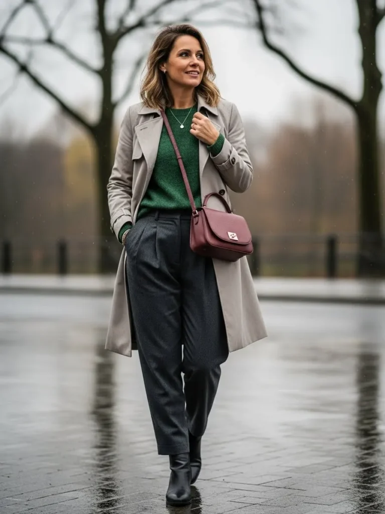 Ankle boots add structure while keeping the outfit grounded for wet streets.