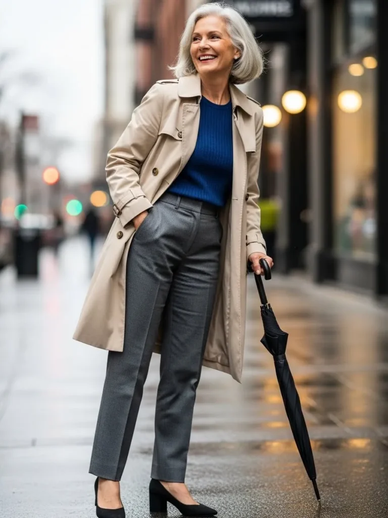 A light beige trench coat is paired with a blue knit top and tailored gray trousers.