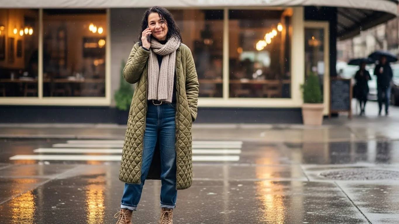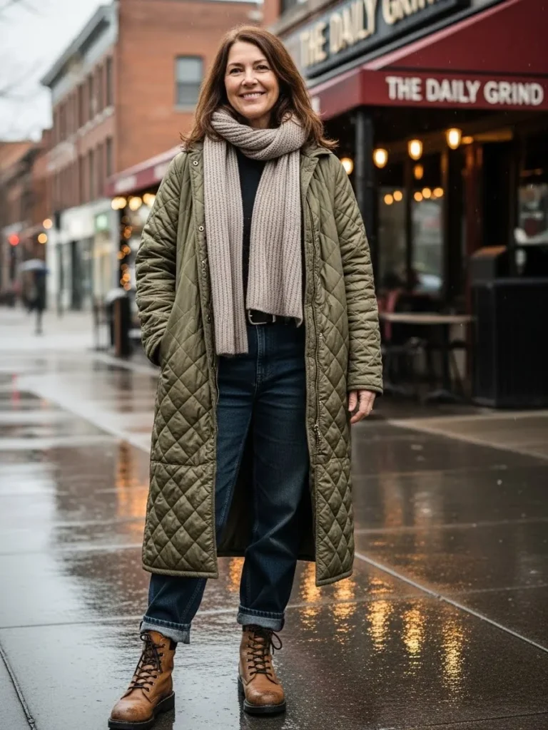 A quilted olive coat is styled with a chunky beige scarf, relaxed jeans, and sturdy lace-up boots.