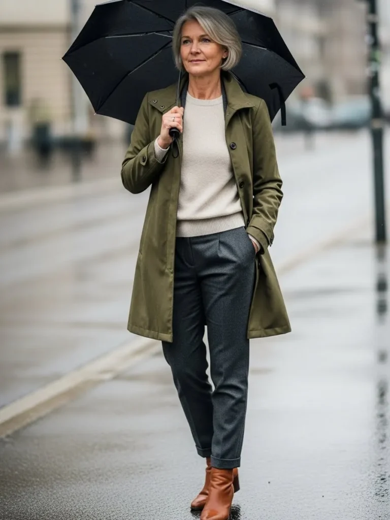 An olive raincoat is styled with a light sweater, dark trousers, and ankle boots, finished with a black umbrella.