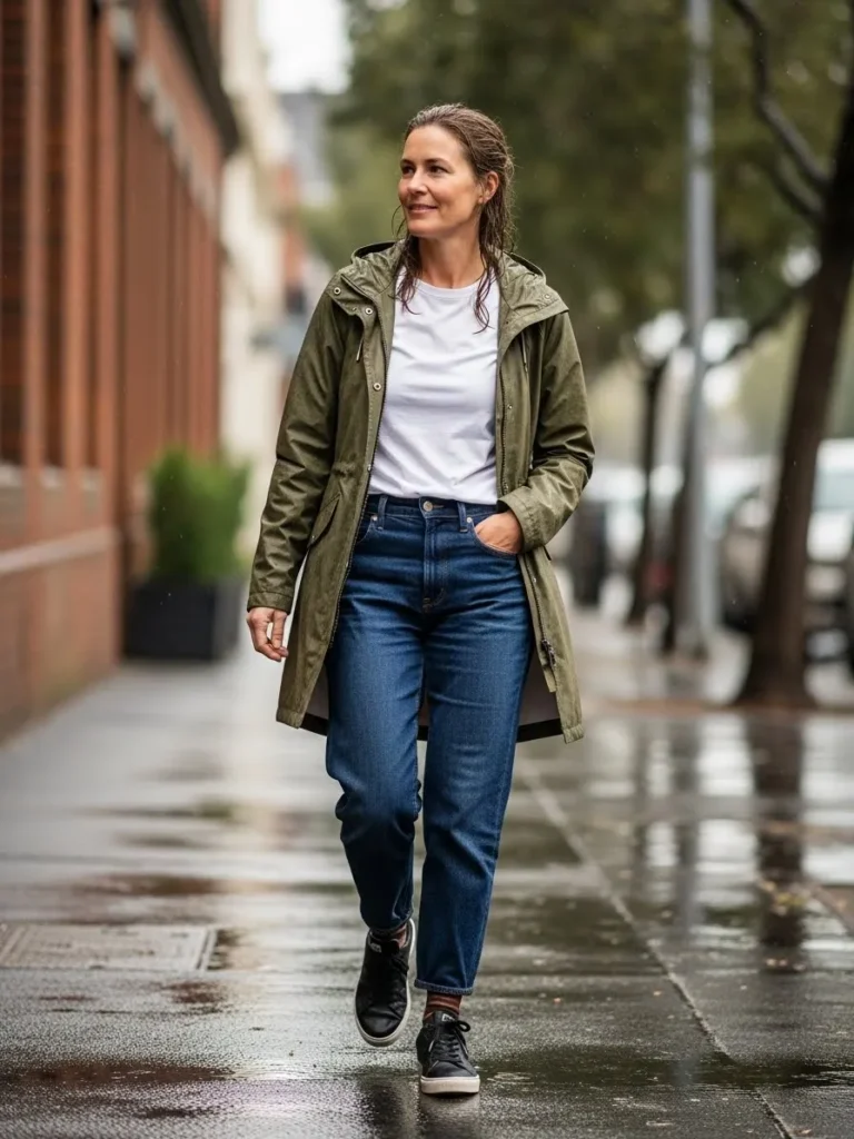 An olive green rain jacket is styled with a casual top, relaxed jeans, and crisp white sneakers.