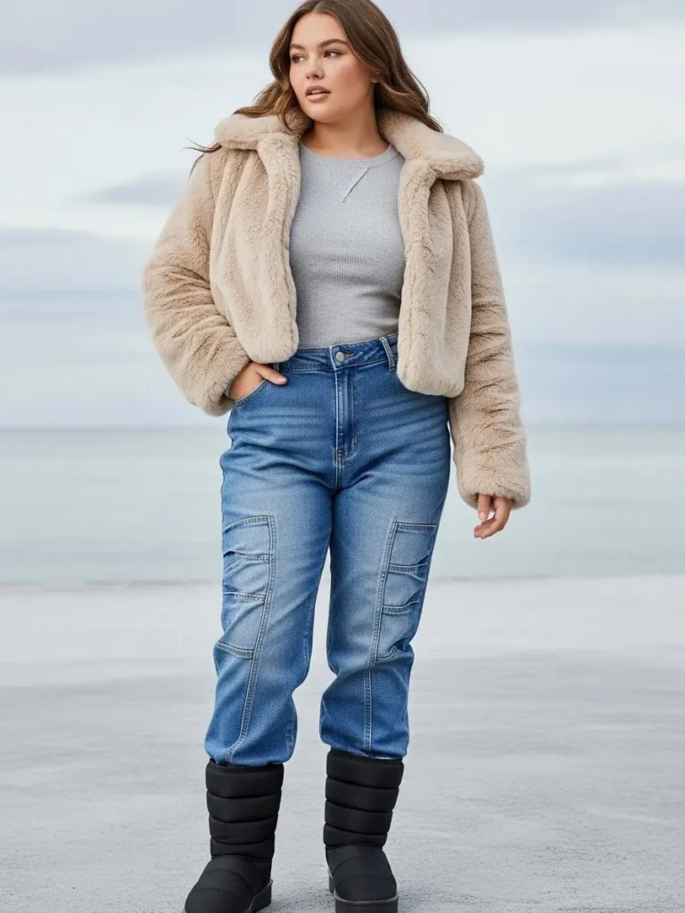 This outfit pairs a cozy beige faux fur jacket with a simple ribbed gray top that feels soft and effortless. The light wash cargo style jeans add a fun modern twist with their stitching and pockets, giving the whole look a little edge while still feeling super wearable. The black padded winter boots keep everything practical and warm, making this the kind of outfit you can wear from a chilly boardwalk walk to a casual hangout without changing a thing. The overall vibe is comfy, cute, and easygoing with that teen cool girl confidence.
