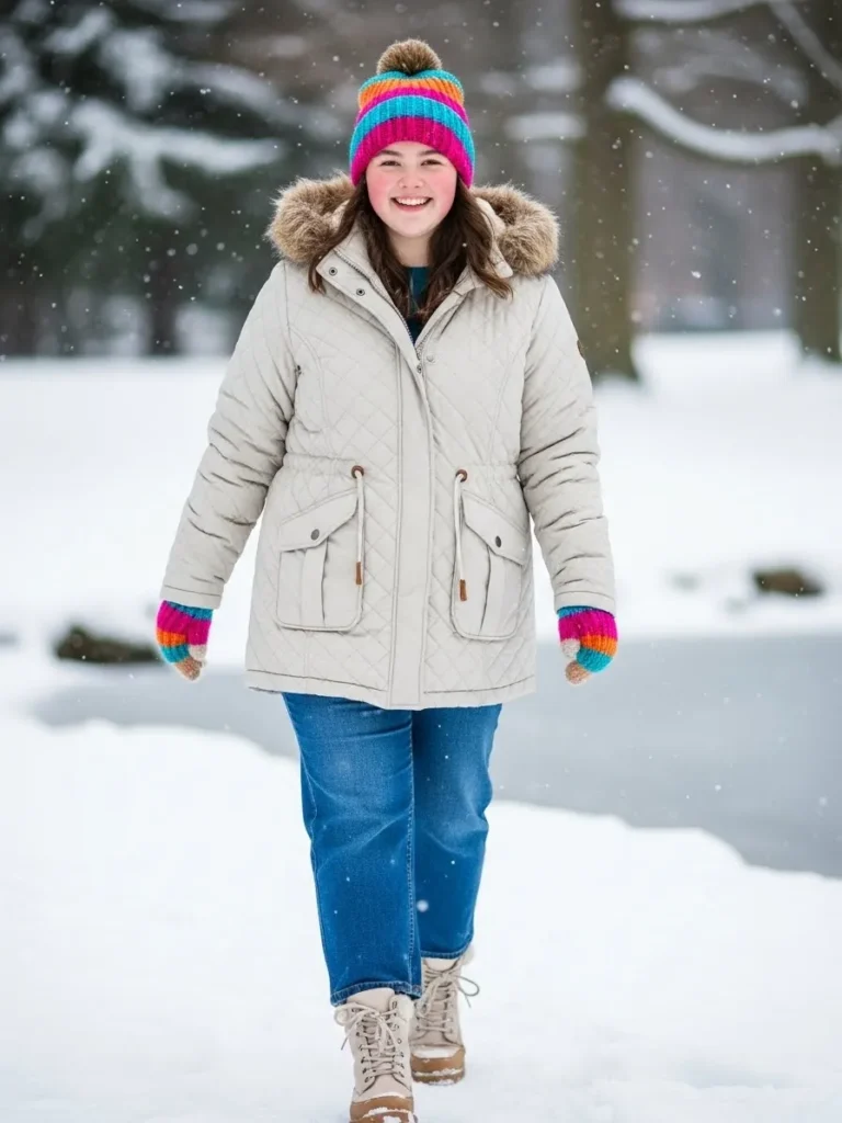 I love how this outfit feels fun without trying too hard. The neutral parka gives a clean base while the rainbow accessories add personality in the sweetest way. I always feel more confident when an outfit is both warm and cheerful and this combo does exactly that. It keeps the silhouette simple but still gives room for color which is such a flattering balance for teen winter style.