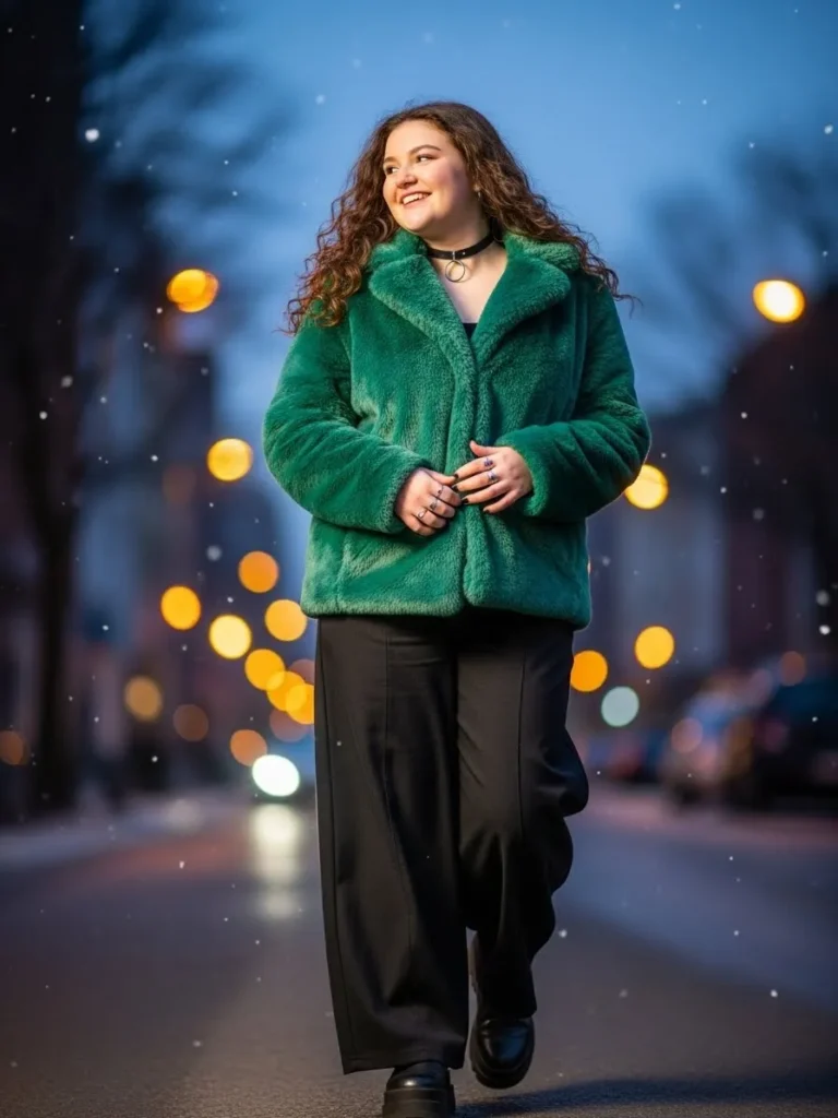 This outfit is such a fun and bold winter moment. The rich emerald faux fur jacket instantly steals the show with its soft plush texture and bright cozy energy. It pairs perfectly with the flowy black wide leg pants that give the look a relaxed and effortless vibe. The chunky black boots ground everything and add a little edge. The simple choker necklace and curly hair make the whole outfit feel teen friendly and full of personality. The snowy background and soft street lights make the green pop even more.