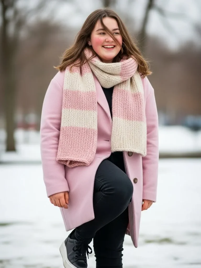 This outfit is all about sweet winter color and easy comfort. The soft pink coat brings a cozy pop to the snowy backdrop and pairs perfectly with the chunky striped scarf in cream and blush. The black top and black skinny pants keep everything grounded while the black sneakers add a playful, on the go vibe that still feels practical for chilly days. The whole look feels warm and cheerful with a cute, bundled up finish that fits a teen friendly winter aesthetic.