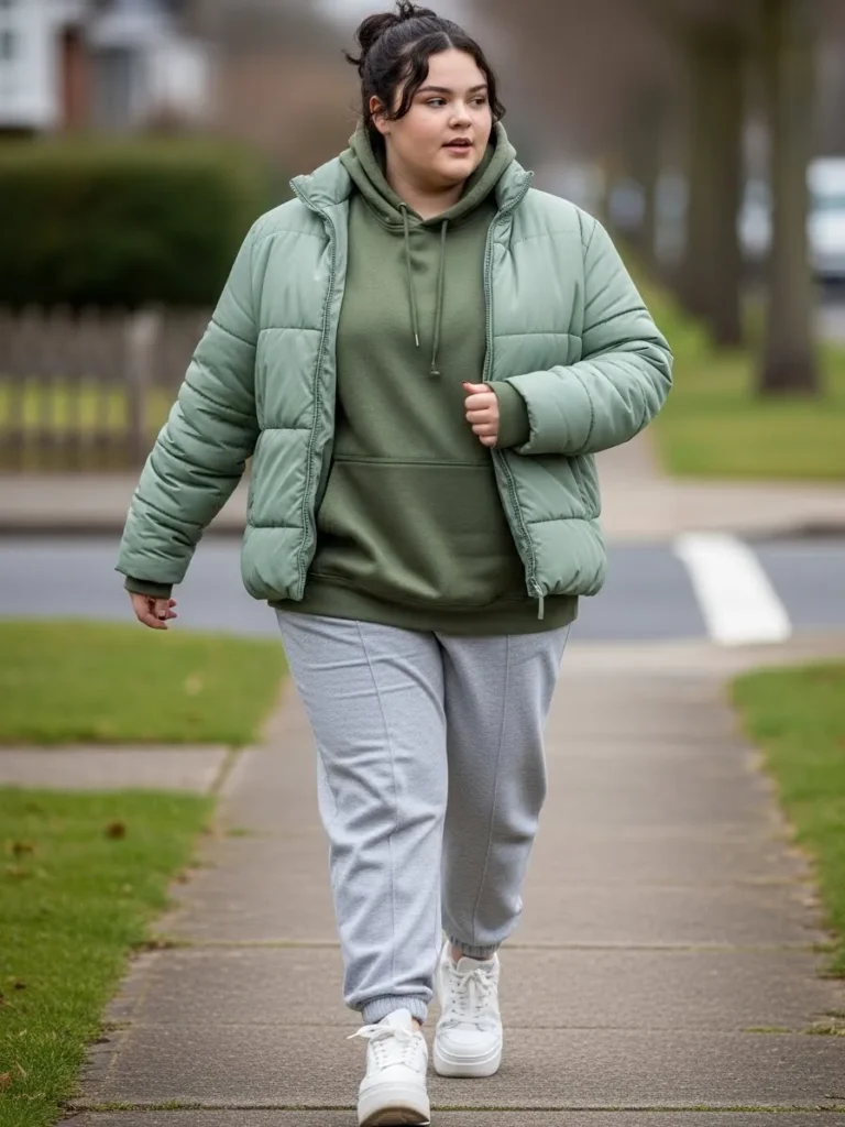 I love how this outfit feels effortless yet intentional. The monochrome greens make it look stylish without trying too hard and the light joggers balance out the darker hoodie so it never feels heavy. The puffer adds warmth without bulk which is a win for plus size winter style. This is one of those outfits where I feel cute but also like I can move, breathe, and actually enjoy my day. It just works.