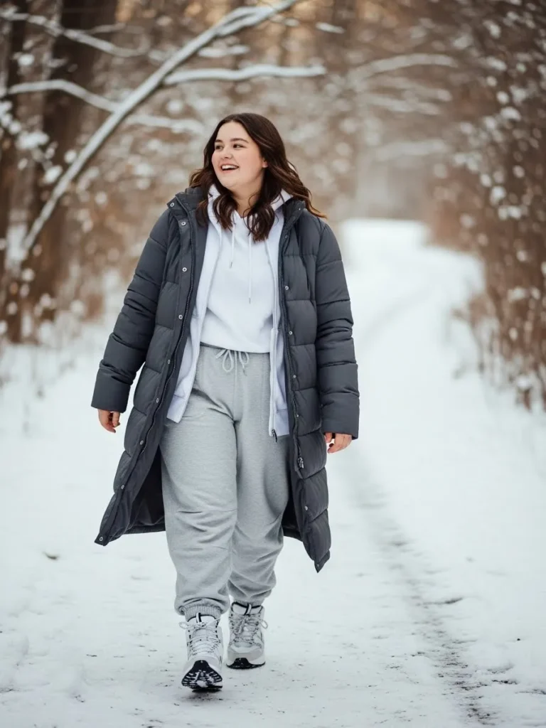 This outfit is the definition of comfy winter vibes in the cutest way. The long charcoal puffer coat brings all the warmth without hiding the shape of the cozy white hoodie underneath. Paired with soft grey joggers that sit just right at the waist, the whole look feels relaxed and effortless. The snow ready boots finish things off with a practical touch that still looks super cute for a winter walk or a casual day out.